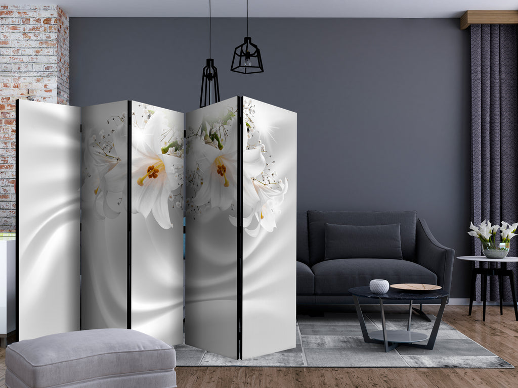 Het decoratieve vouwscherm "Vouwscherm - Royal Whiteness II [Room Dividers]" past uitzonderlijk mooi in een modern interieur. Het houten tweezijdig bedrukte vouwscherm geeft niet alleen een mooie opdeling van een ruimte maar geeft ook een fantastische flair aan uw interieur. De perfectie uitvoering en het originele motief in full HD uitvoering zorgen ervoor dat de kamervouwschermen iedere ruimte een originele charme verschaffen. Een prachtig kamervouwscherm is een zeer originele versiering en kan bijvoorbeeld prima worden toegepast in woningen of dienstruimten. (kapsalon, dokterskliniek, administratiekantoor etc)