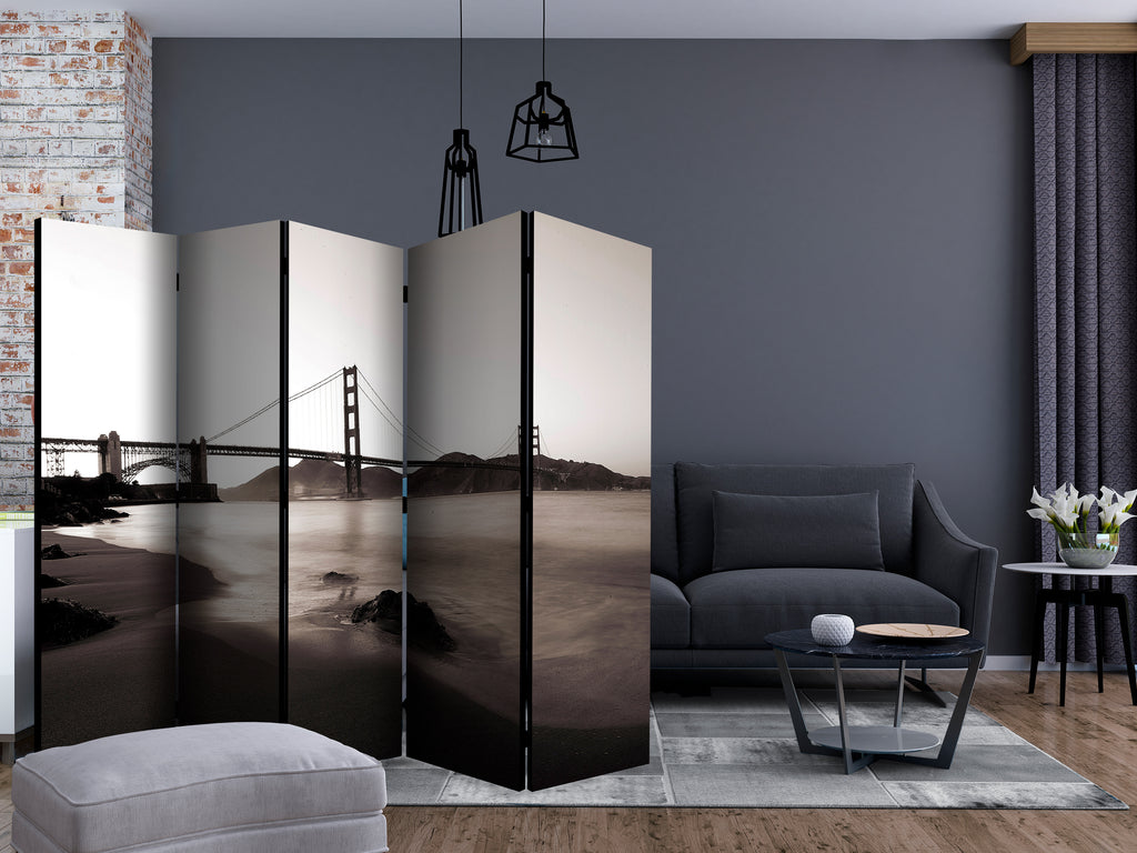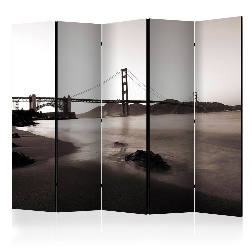 Het decoratieve vouwscherm "Vouwscherm - San Francisco: Golden Gate Bridge in black and white II [Room Dividers]" past uitzonderlijk mooi in een modern interieur. Het houten tweezijdig bedrukte vouwscherm geeft niet alleen een mooie opdeling van een ruimte maar geeft ook een fantastische flair aan uw interieur. De perfectie uitvoering en het originele motief in full HD uitvoering zorgen ervoor dat de kamervouwschermen iedere ruimte een originele charme verschaffen. Een prachtig kamervouwscherm is een zeer originele versiering en kan bijvoorbeeld prima worden toegepast in woningen of dienstruimten. (kapsalon, dokterskliniek, administratiekantoor etc)