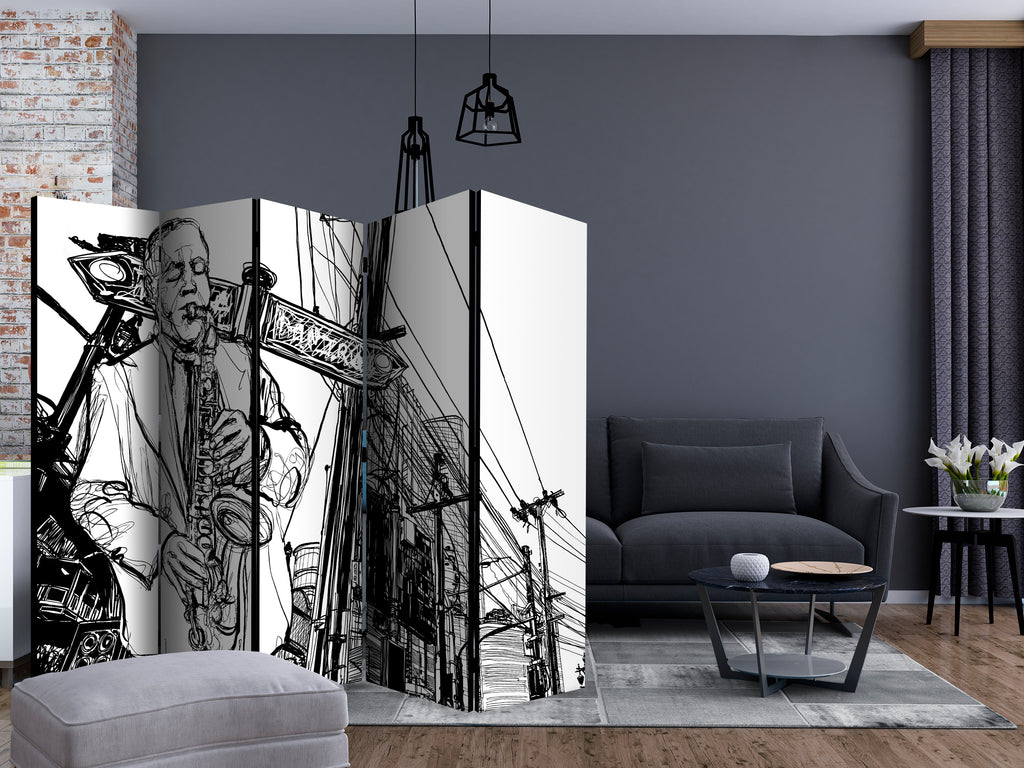 Het decoratieve vouwscherm "Vouwscherm - Saxophone recital on Broadway II [Room Dividers]" past uitzonderlijk mooi in een modern interieur. Het houten tweezijdig bedrukte vouwscherm geeft niet alleen een mooie opdeling van een ruimte maar geeft ook een fantastische flair aan uw interieur. De perfectie uitvoering en het originele motief in full HD uitvoering zorgen ervoor dat de kamervouwschermen iedere ruimte een originele charme verschaffen. Een prachtig kamervouwscherm is een zeer originele versiering en kan bijvoorbeeld prima worden toegepast in woningen of dienstruimten. (kapsalon, dokterskliniek, administratiekantoor etc)