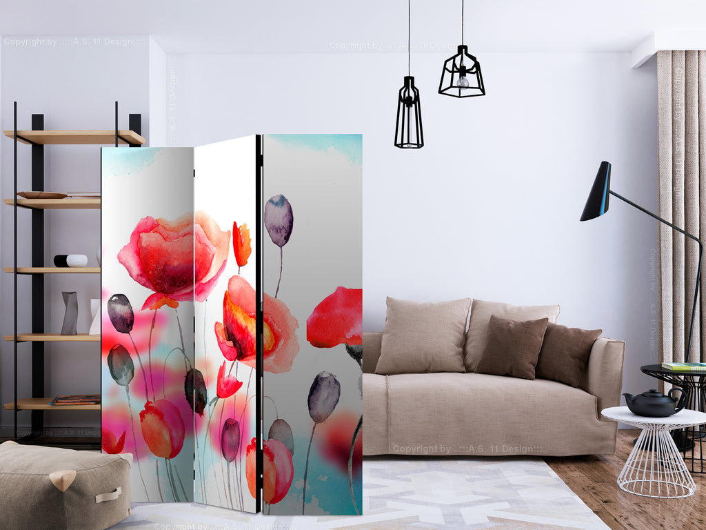 Het decoratieve vouwscherm "Vouwscherm - Swaying with the Wind [Room Dividers]" past uitzonderlijk mooi in een modern interieur. Het houten driedelige en tweezijdig bedrukte vouwscherm geeft niet alleen een mooie opdeling van een ruimte maar geeft ook een fantastische flair aan uw interieur. De perfectie uitvoering en het originele motief in full HD uitvoering zorgen ervoor dat de kamervouwschermen iedere ruimte een originele charme verschaffen. Een prachtig kamervouwscherm is een zeer originele versiering en kan bijvoorbeeld prima worden toegepast in woningen of dienstruimten. (kapsalon, dokterskliniek, administratiekantoor etc)