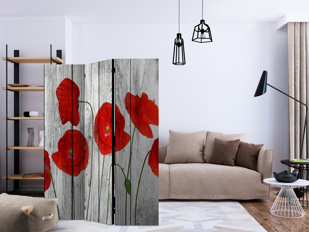 Het decoratieve vouwscherm "Vouwscherm - Tale of Red Poppies [Room Dividers]" past uitzonderlijk mooi in een modern interieur. Het houten driedelige en tweezijdig bedrukte vouwscherm geeft niet alleen een mooie opdeling van een ruimte maar geeft ook een fantastische flair aan uw interieur. De perfectie uitvoering en het originele motief in full HD uitvoering zorgen ervoor dat de kamervouwschermen iedere ruimte een originele charme verschaffen. Een prachtig kamervouwscherm is een zeer originele versiering en kan bijvoorbeeld prima worden toegepast in woningen of dienstruimten. (kapsalon, dokterskliniek, administratiekantoor etc)