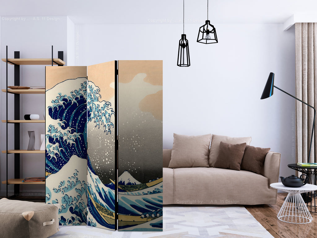 Het decoratieve vouwscherm "Vouwscherm - The Great Wave off Kanagawa [Room Dividers]" past uitzonderlijk mooi in een modern interieur. Het houten driedelige en tweezijdig bedrukte vouwscherm geeft niet alleen een mooie opdeling van een ruimte maar geeft ook een fantastische flair aan uw interieur. De perfectie uitvoering en het originele motief in full HD uitvoering zorgen ervoor dat de kamervouwschermen iedere ruimte een originele charme verschaffen. Een prachtig kamervouwscherm is een zeer originele versiering en kan bijvoorbeeld prima worden toegepast in woningen of dienstruimten. (kapsalon, dokterskliniek, administratiekantoor etc)