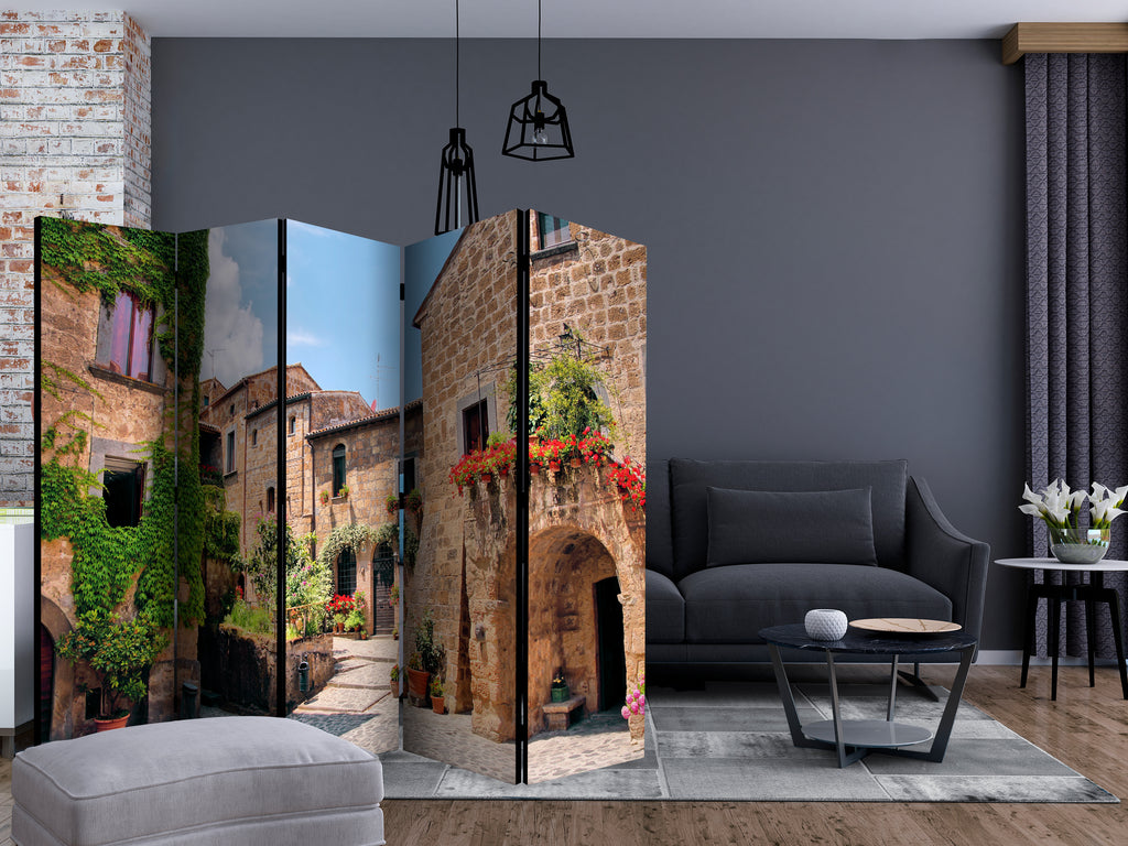 Het decoratieve vouwscherm "Vouwscherm - Tuscan alley II [Room Dividers]" past uitzonderlijk mooi in een modern interieur. Het houten tweezijdig bedrukte vouwscherm geeft niet alleen een mooie opdeling van een ruimte maar geeft ook een fantastische flair aan uw interieur. De perfectie uitvoering en het originele motief in full HD uitvoering zorgen ervoor dat de kamervouwschermen iedere ruimte een originele charme verschaffen. Een prachtig kamervouwscherm is een zeer originele versiering en kan bijvoorbeeld prima worden toegepast in woningen of dienstruimten. (kapsalon, dokterskliniek, administratiekantoor etc)