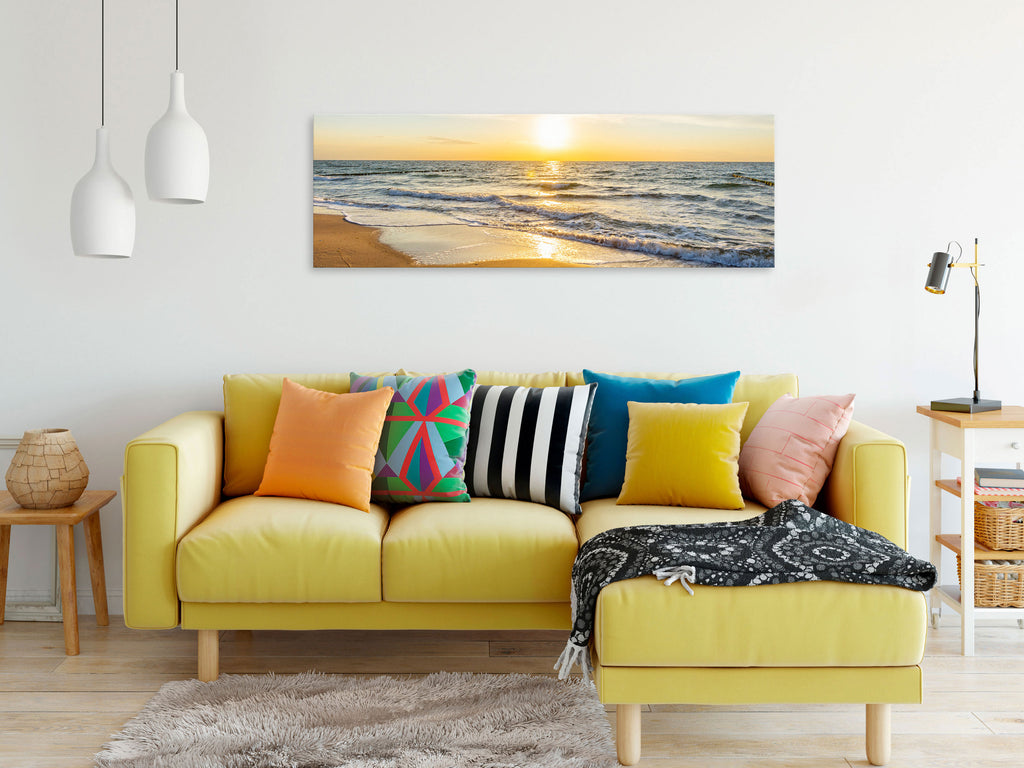 Laat de canvas print "Schilderij - Calm Waves (1 Part) Narrow Golden" uw woning en de woningen van uw dierbaren veranderen!