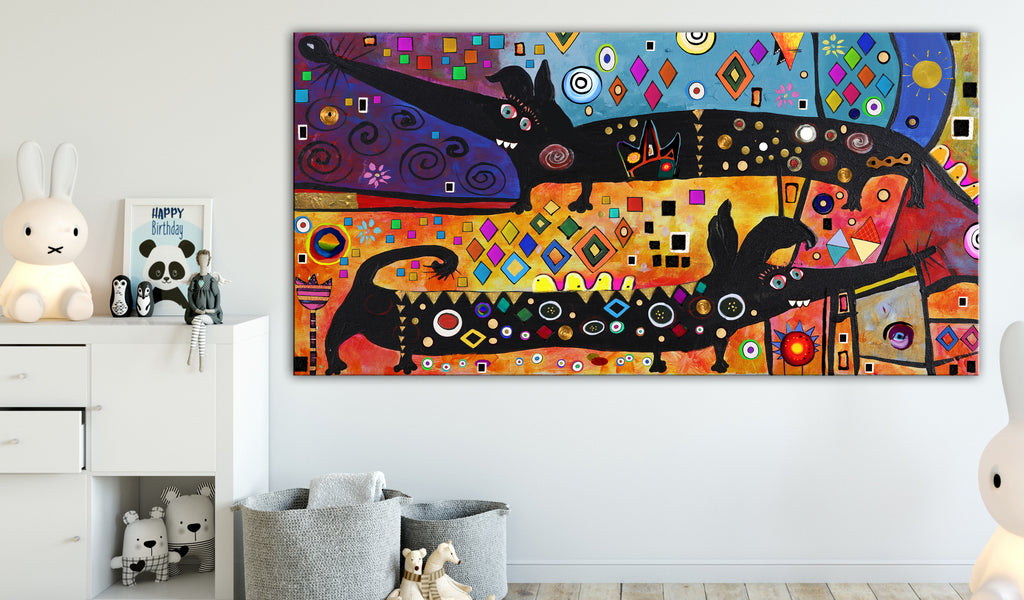 Laat de canvas print "Schilderij - Extravagant Dogs (1 Part) Wide" uw woning en de woningen van uw dierbaren veranderen!