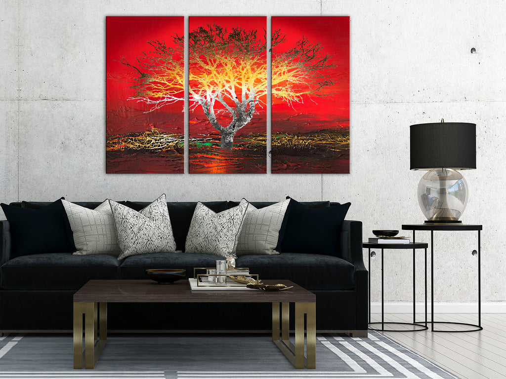 Laat de canvas print "Schilderij - Fiery Sky (3 Parts)" uw woning en de woningen van uw dierbaren veranderen!
