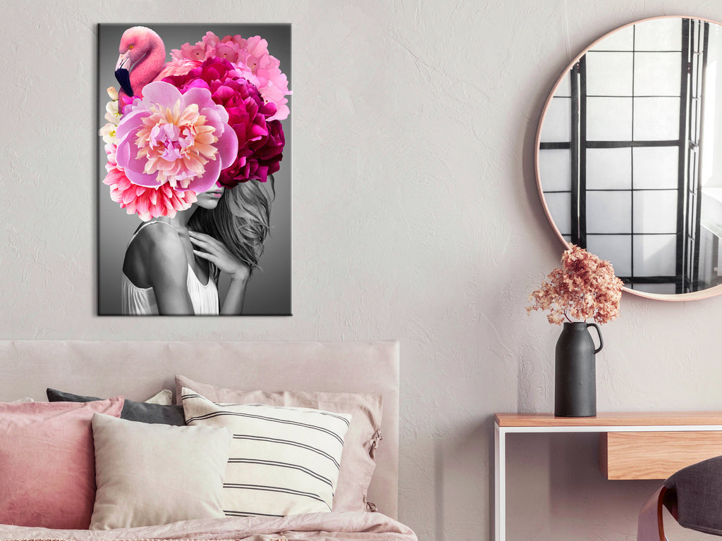 Laat de canvas print "Schilderij - Flamingo Girl (1 Part) Vertical" uw woning en de woningen van uw dierbaren veranderen!