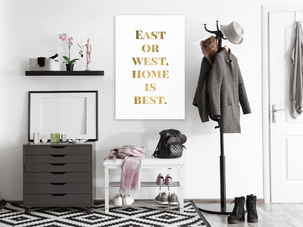 Laat de canvas print "Schilderij - Gold Home Is Best (1 Part) Vertical" uw woning en de woningen van uw dierbaren veranderen!