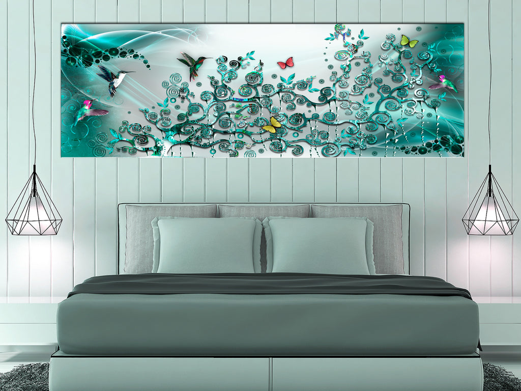 Laat de canvas print "Schilderij - Hummingbirds Dance (1 Part) Turquoise Narrow" uw woning en de woningen van uw dierbaren veranderen!