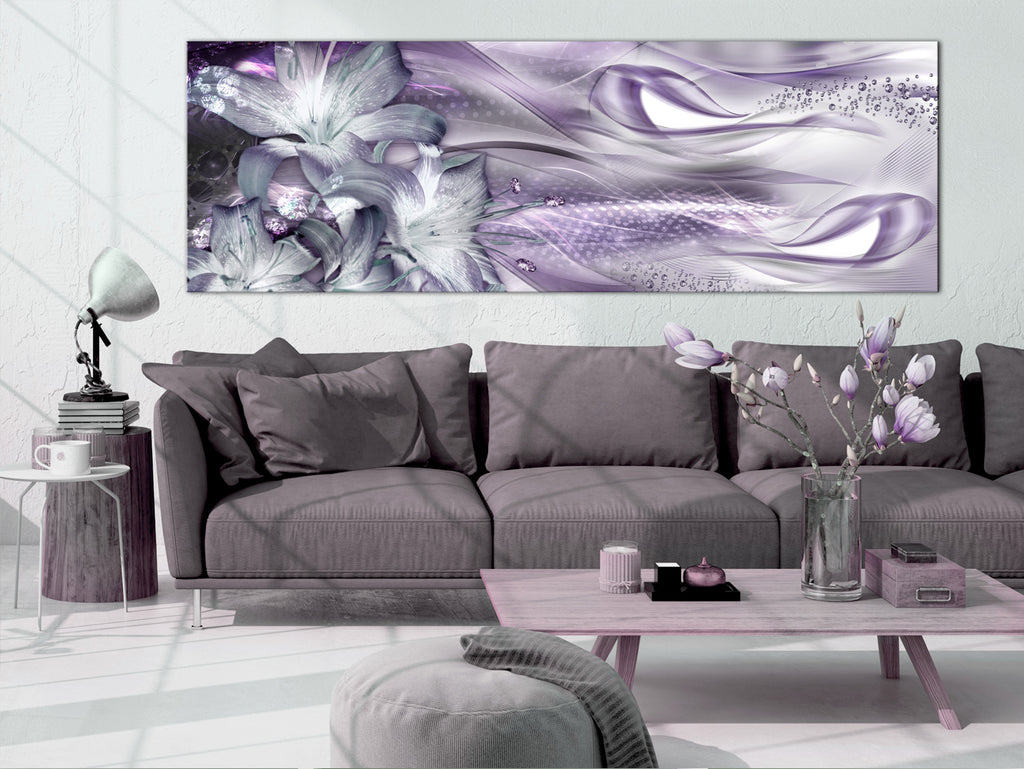 Laat de canvas print "Schilderij - Lilies and Waves (1 Part) Narrow Pale Violet" uw woning en de woningen van uw dierbaren veranderen!