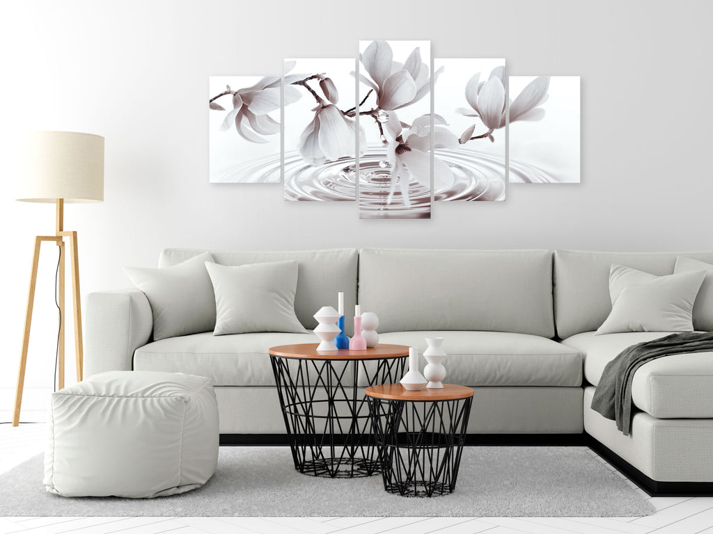 Laat de canvas print "Schilderij - Magnolias over Water (5 Parts) Wide Grey" uw woning en de woningen van uw dierbaren veranderen!
