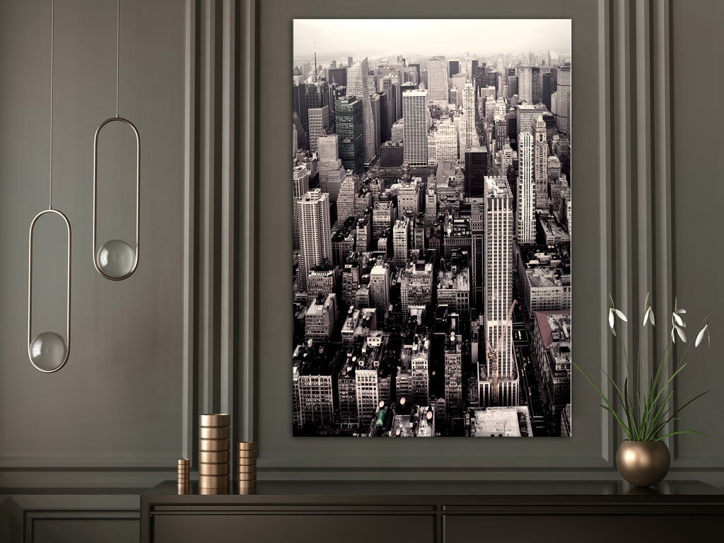 Laat de canvas print "Schilderij - Manhattan In Sepia (1 Part) Vertical" uw woning en de woningen van uw dierbaren veranderen!