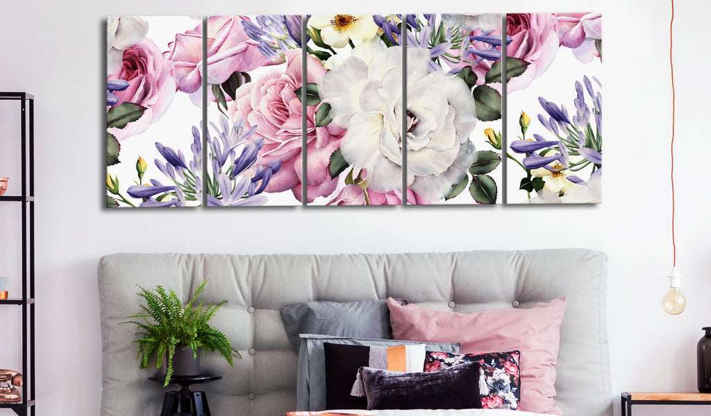 Laat de canvas print "Schilderij - Rose Composition (5 Parts) Narrow Colourful" uw woning en de woningen van uw dierbaren veranderen!