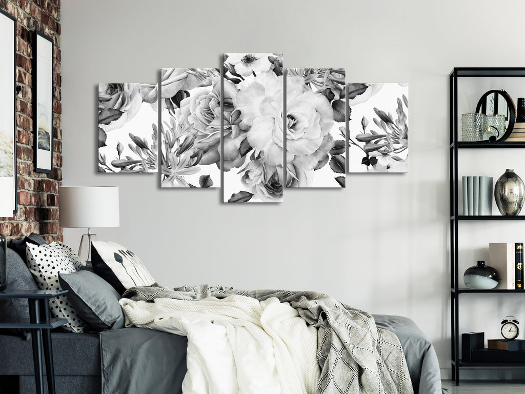 Laat de canvas print "Schilderij - Rose Composition (5 Parts) Wide Black and White" uw woning en de woningen van uw dierbaren veranderen!