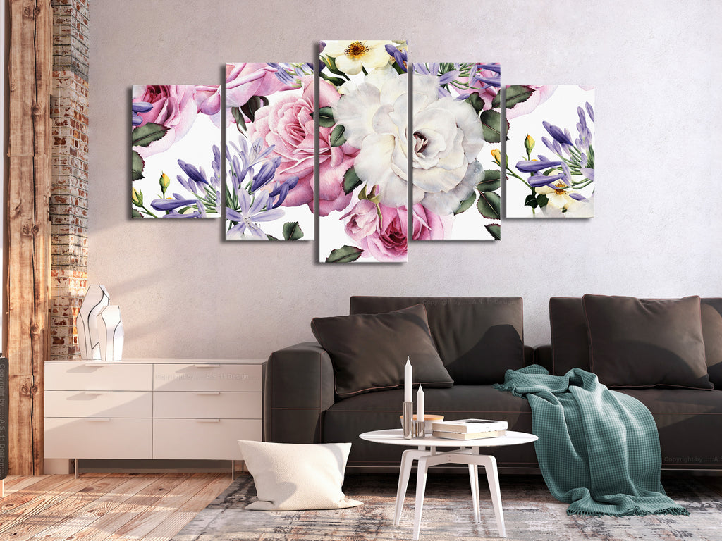 Laat de canvas print "Schilderij - Rose Composition (5 Parts) Wide Colourful" uw woning en de woningen van uw dierbaren veranderen!