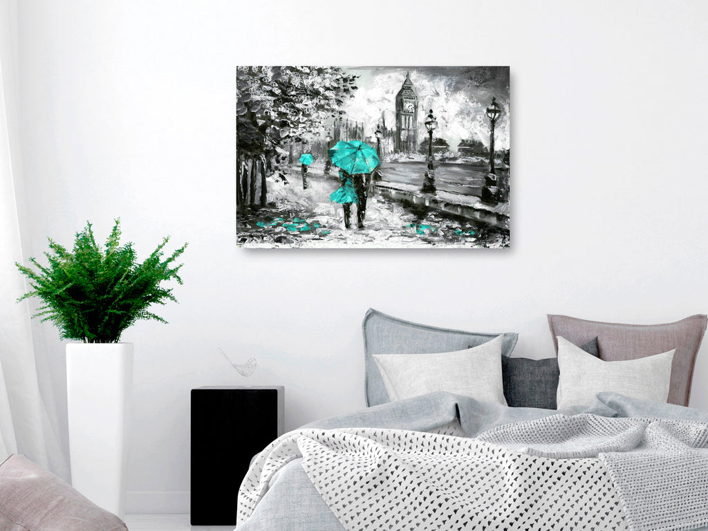 Laat de canvas print "Schilderij - Walk in London (1 Part) Wide Turquoise" uw woning en de woningen van uw dierbaren veranderen!